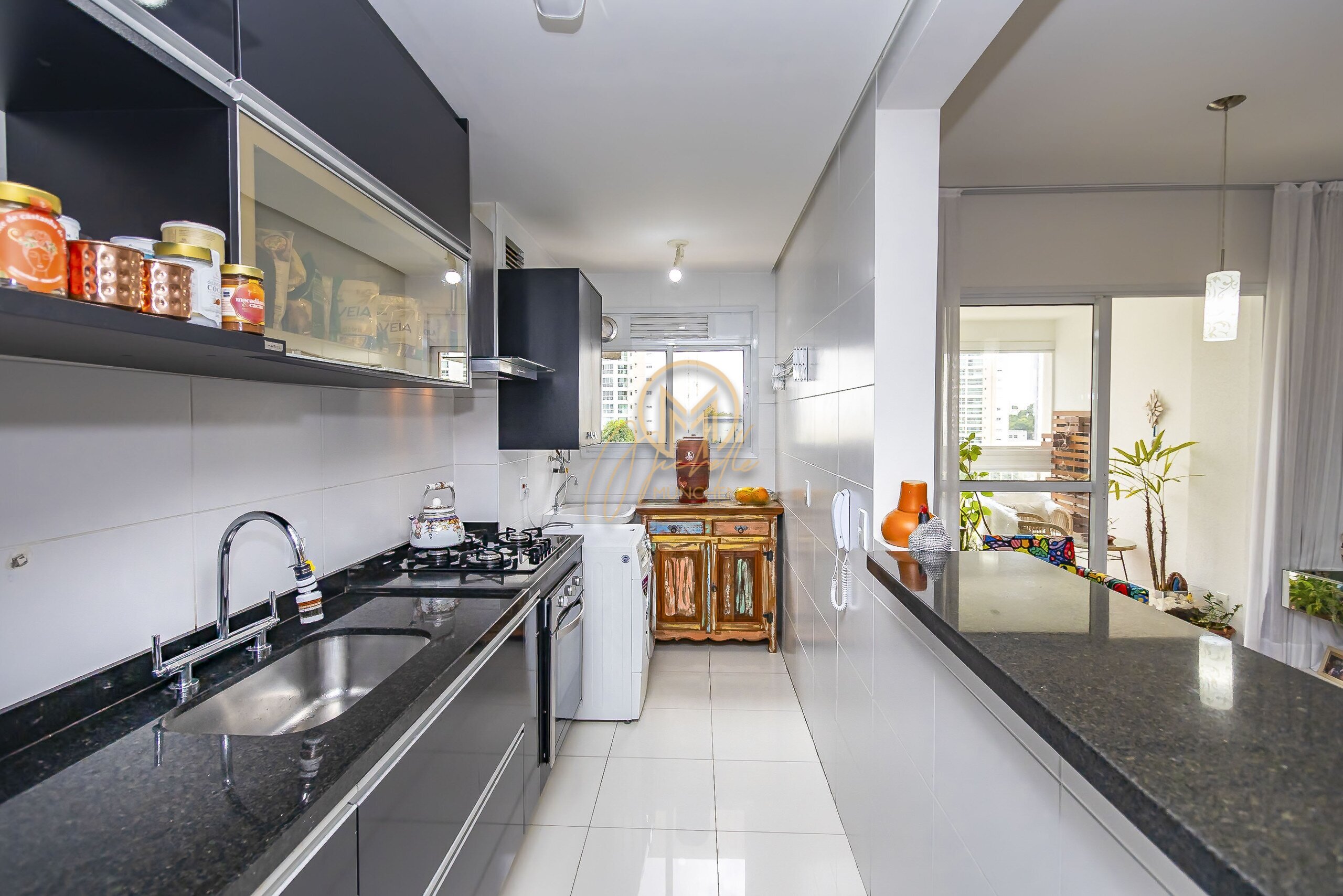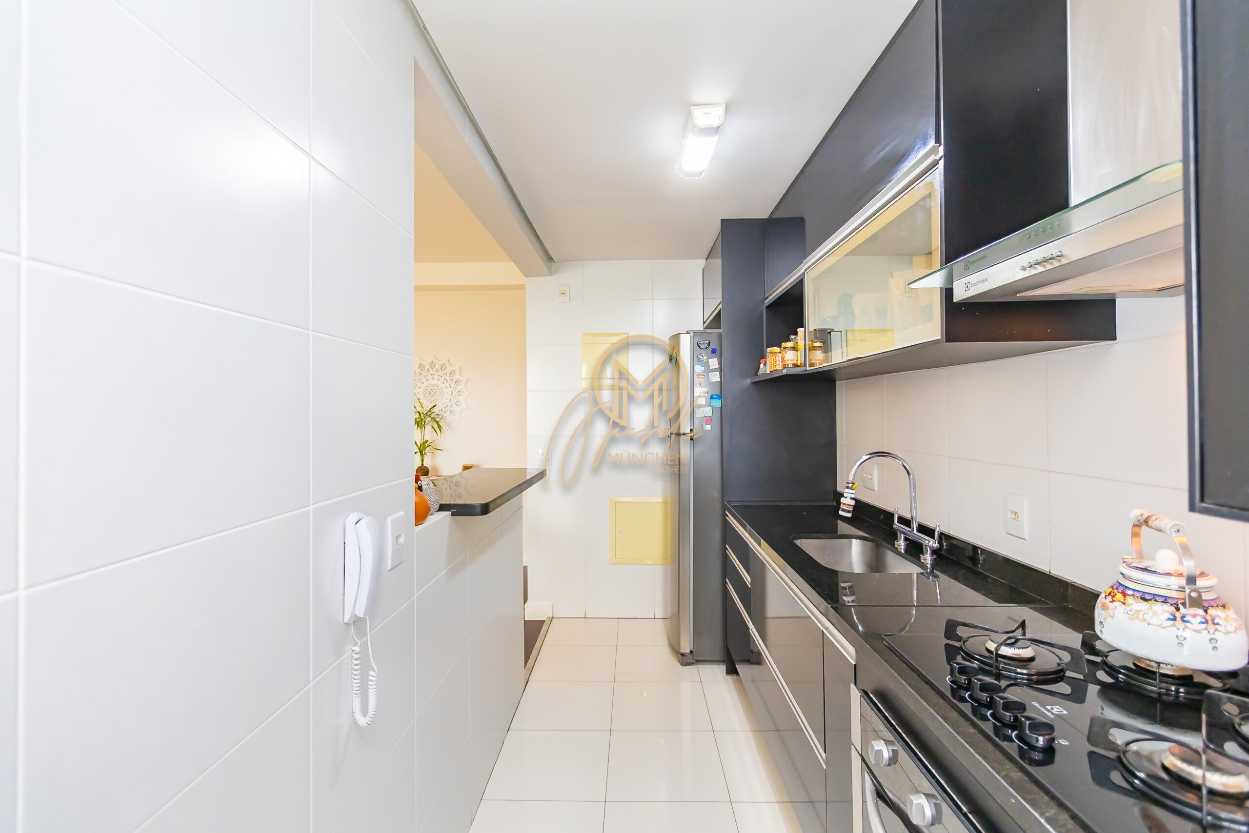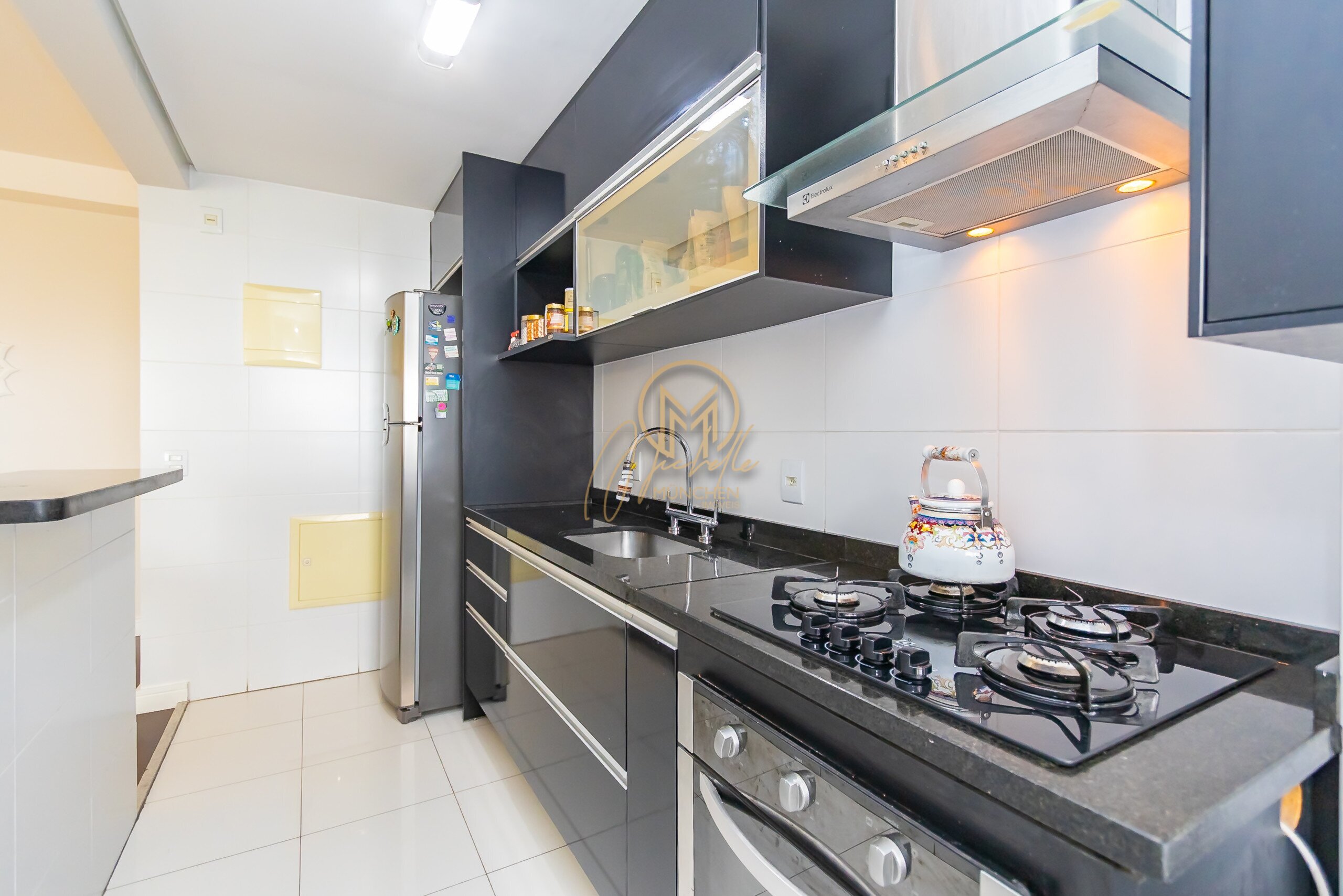 Cozinha com: fogão, cooktop, forno embutido e coifa