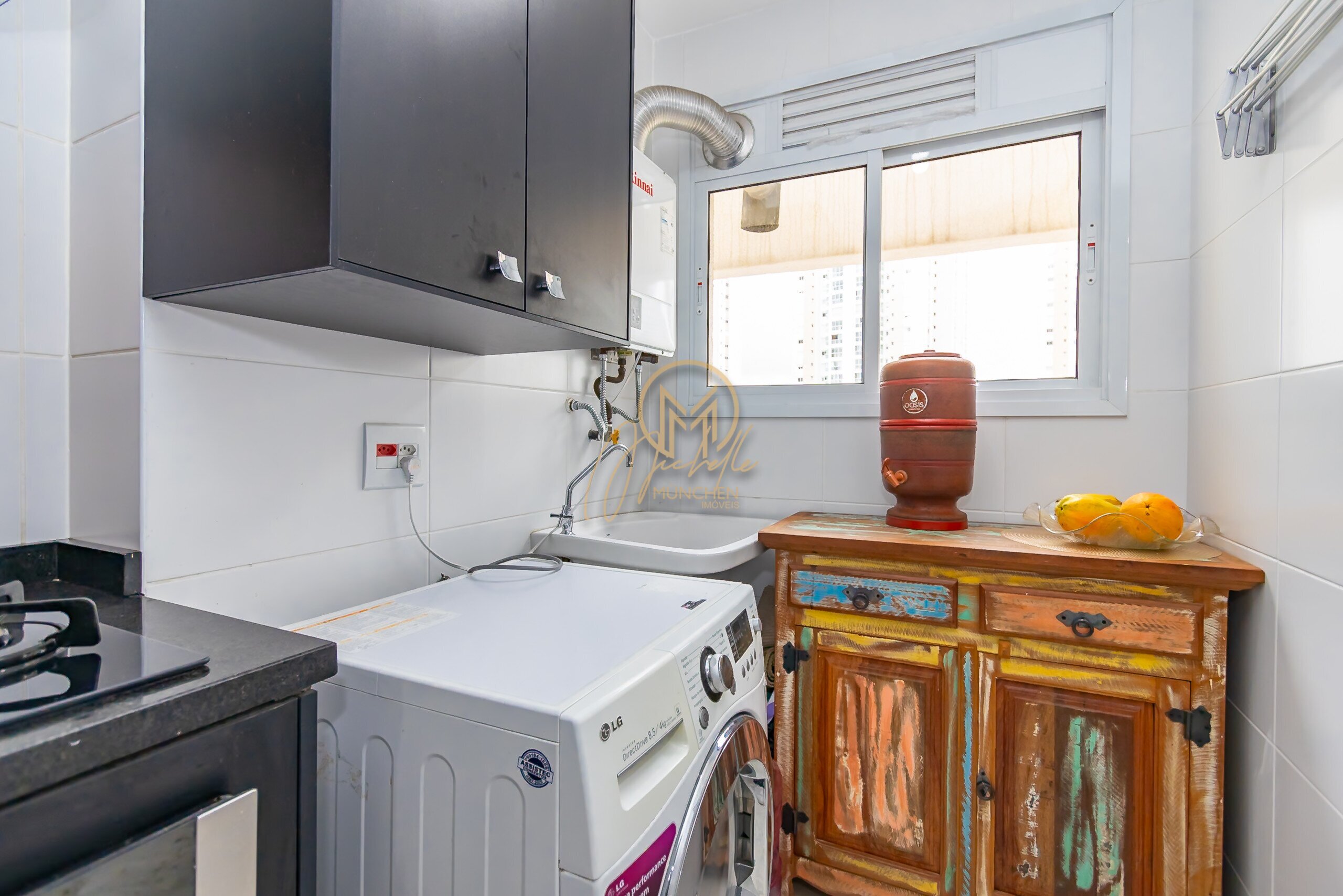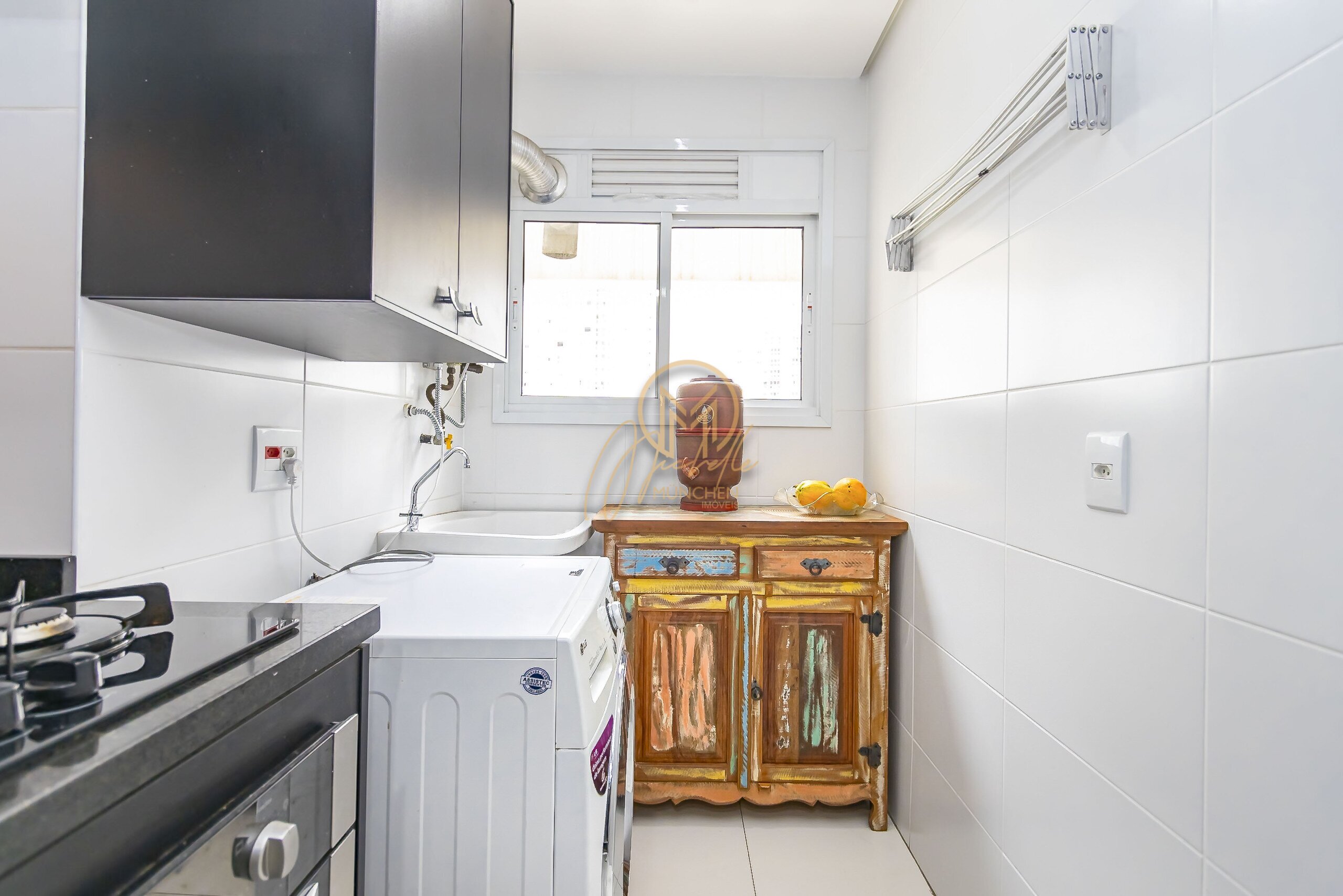 Lavanderia equipada: armários, tanque e aquecedor