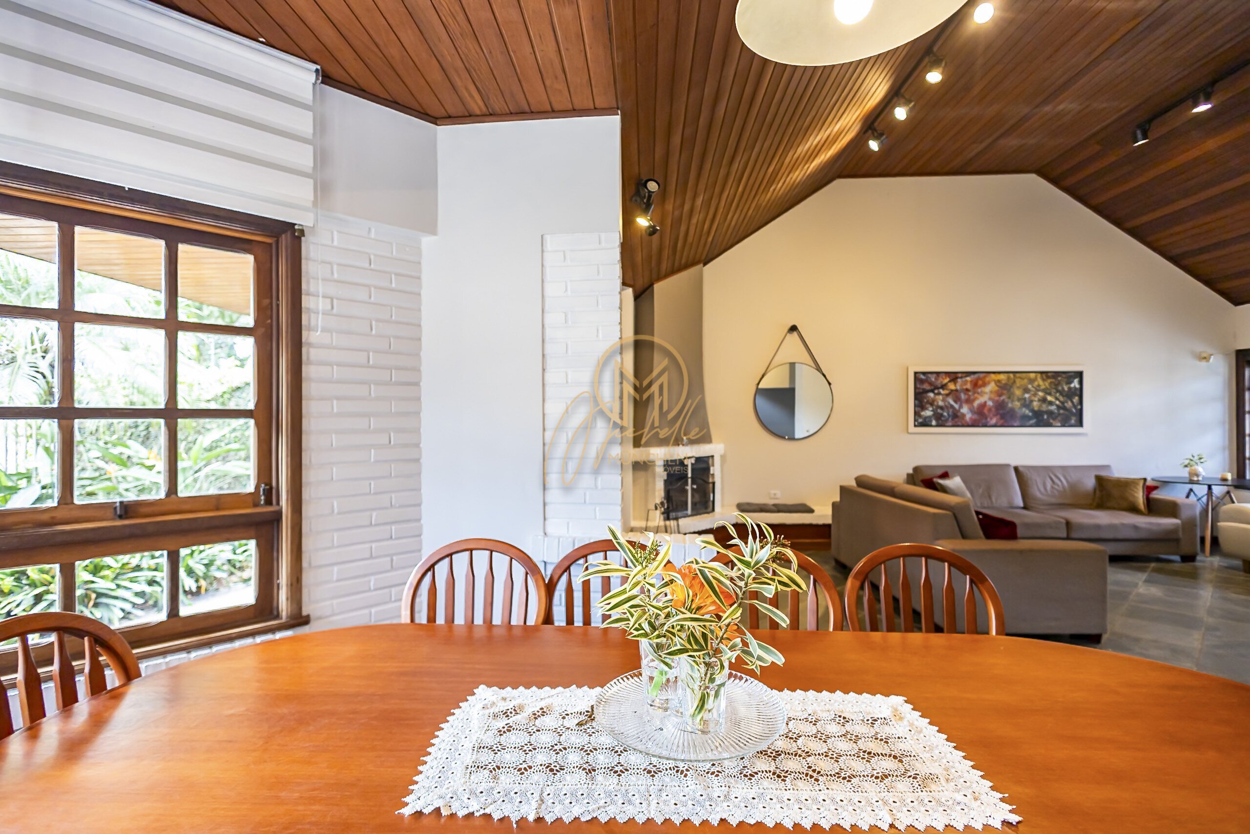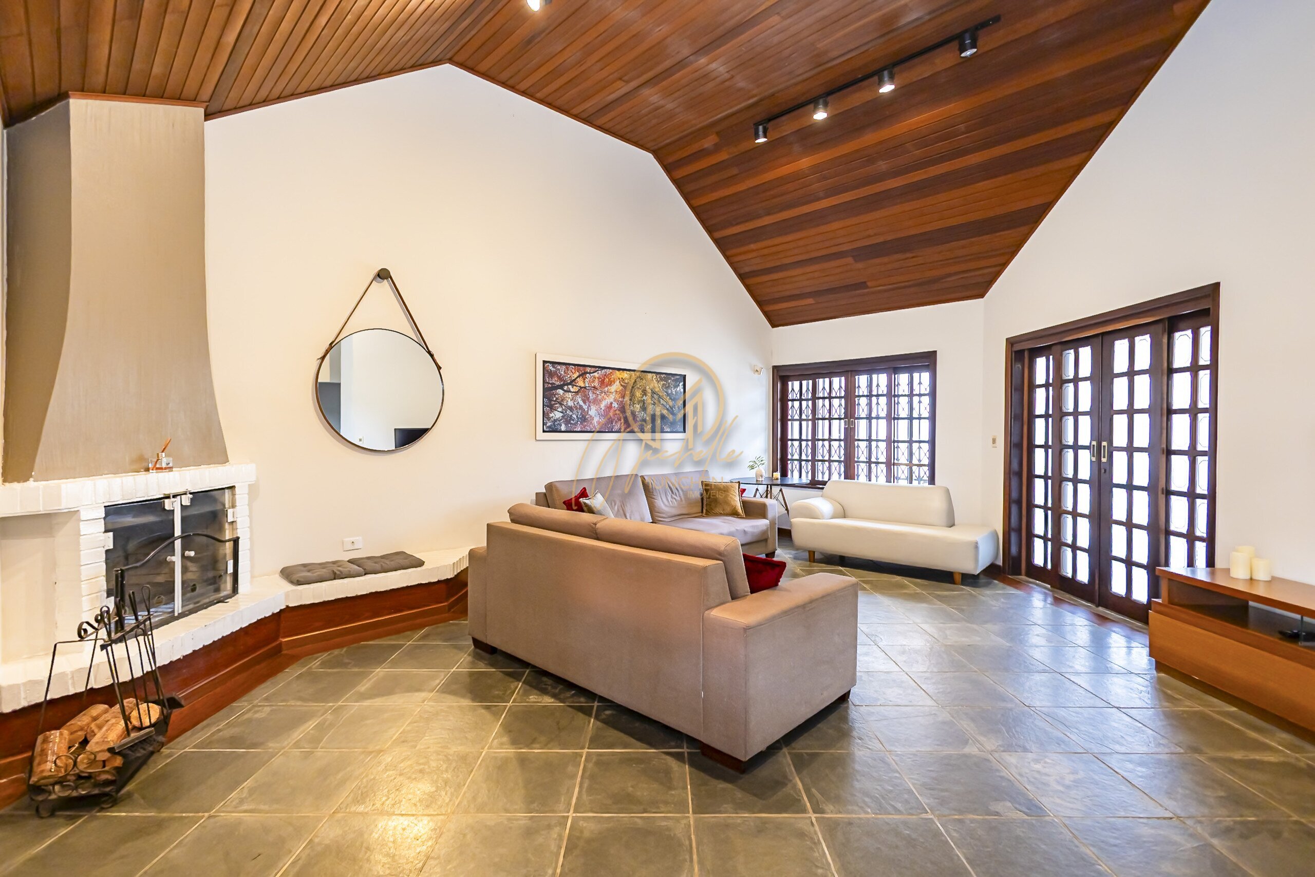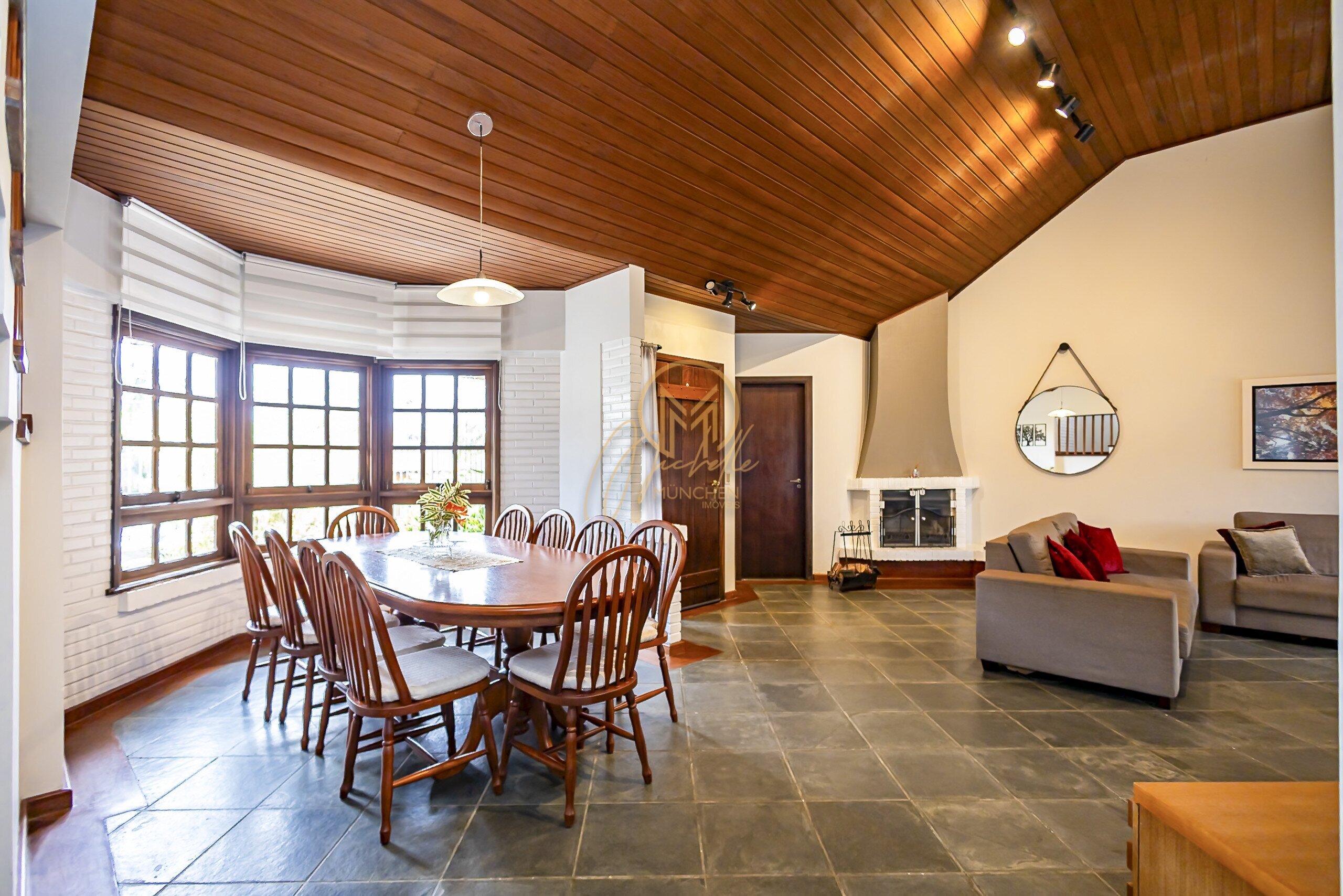 Sala ampla para 3 ambientes com lareira a carvão