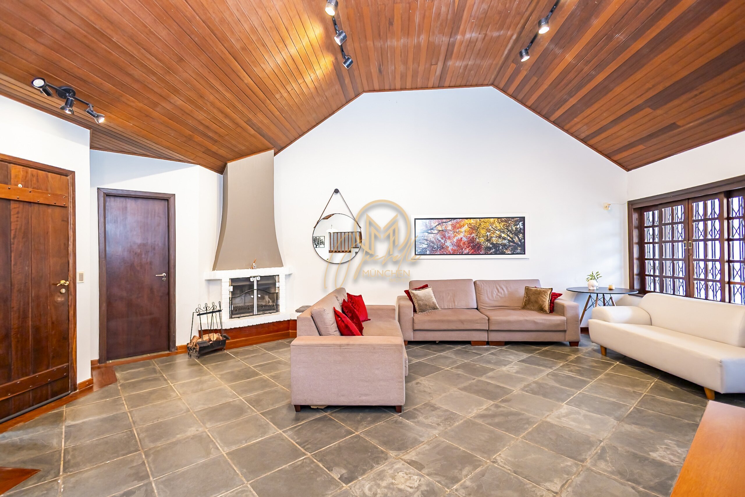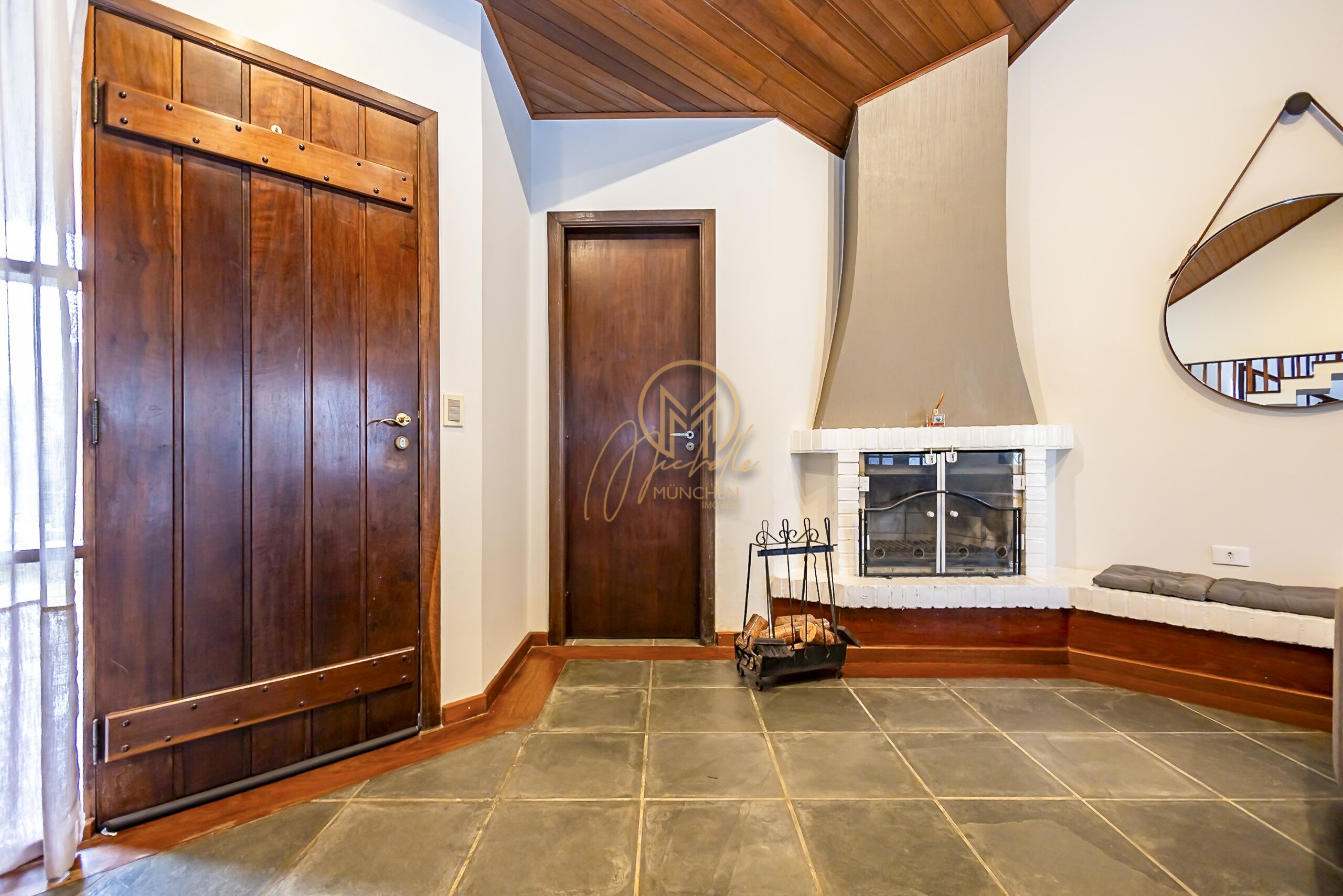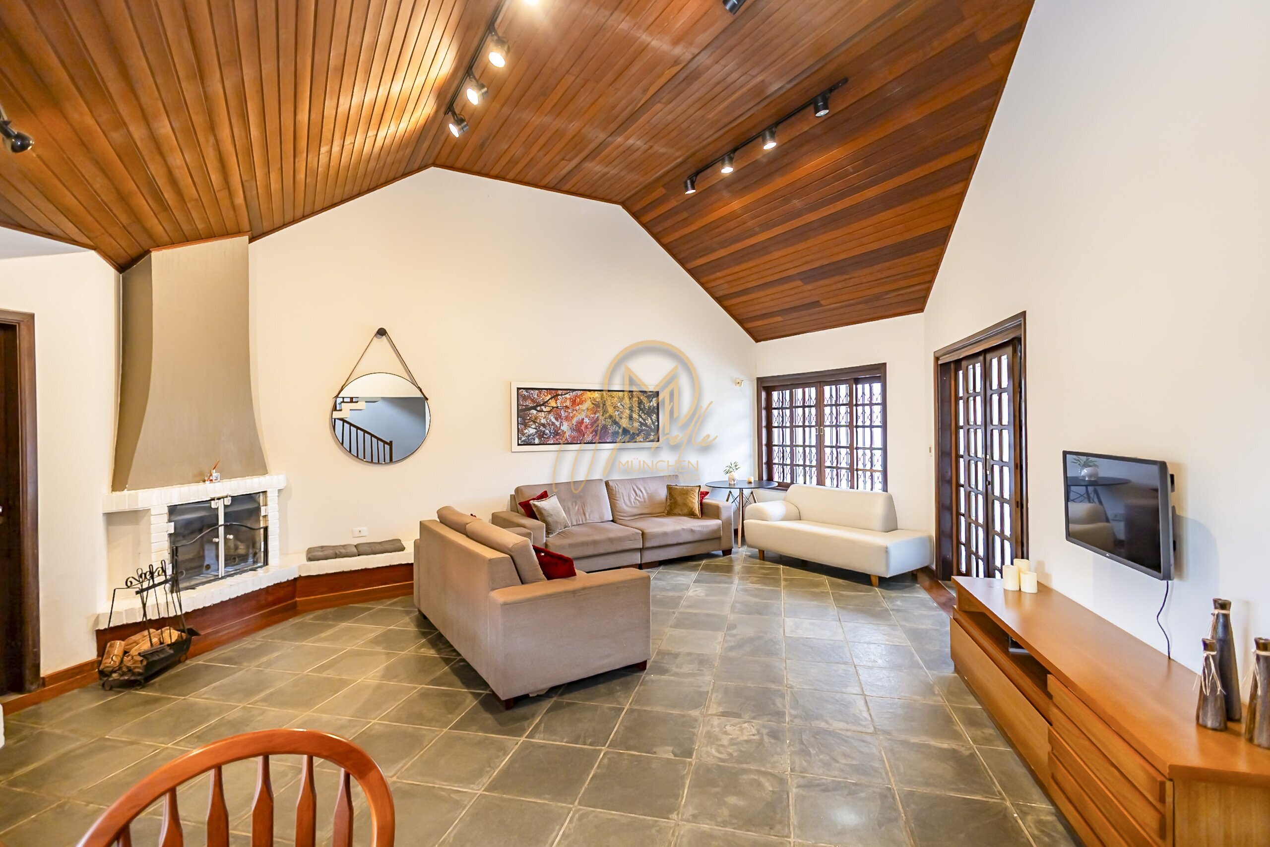 Sala ampla para 3 ambientes com lareira a carvão